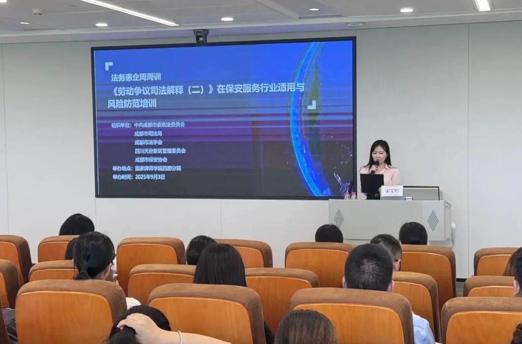为进一步提升保安服务行业在用工管理中的法律风险防范能力,助力企业应对劳动关系管理中的新挑战,2025年9月3日,在成都市委政法委、成都市公安局户政管理局的指导下,成都市保安协会于国家律师学院西部分院成功举办了《劳动争议司法解释(二)》在保安服务行业适用与风险防范专题培训。培训人数达一百余人。